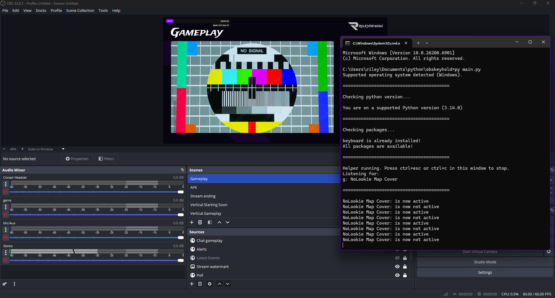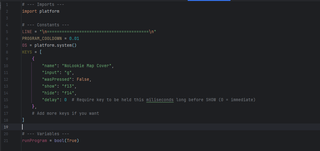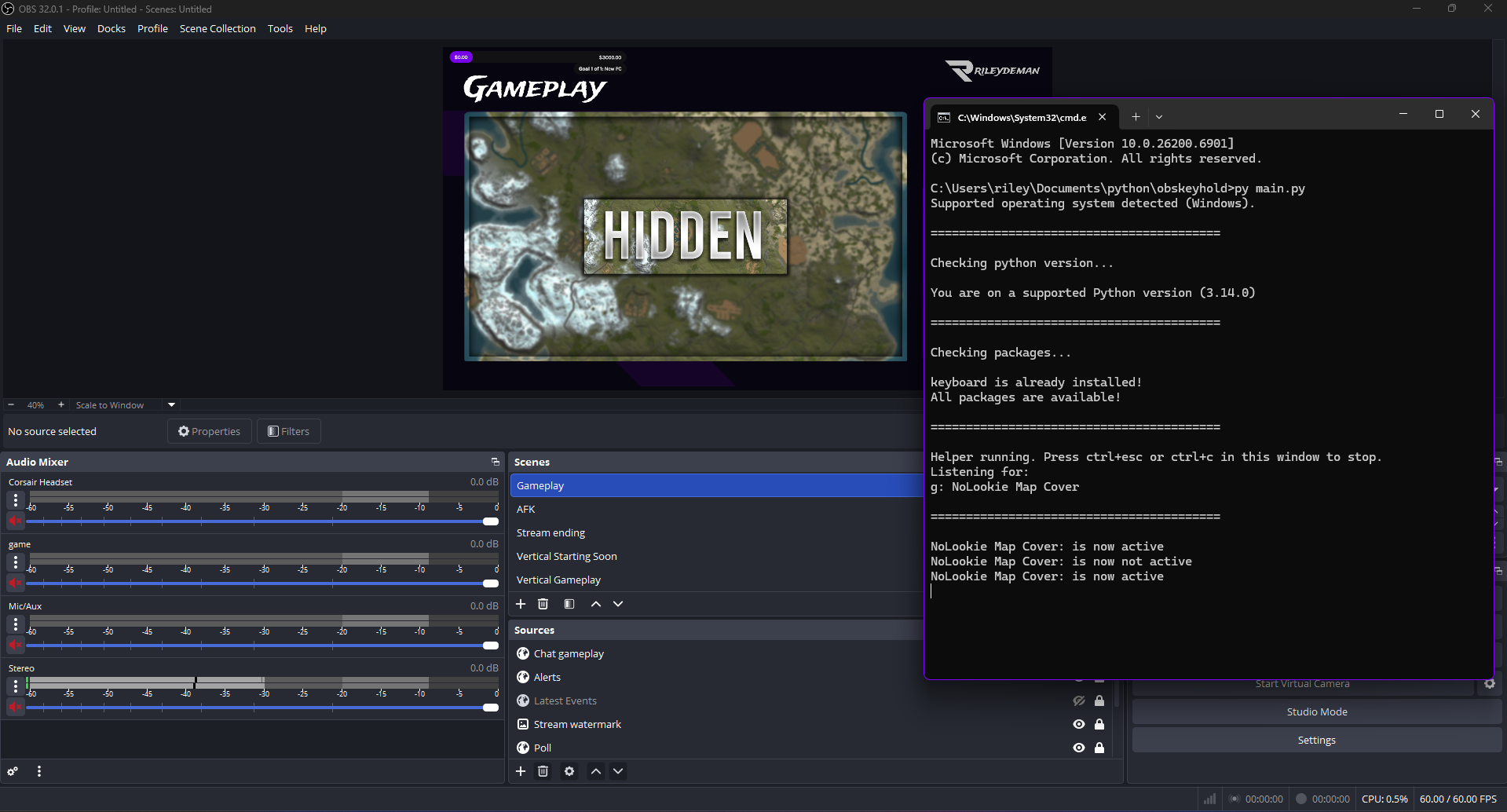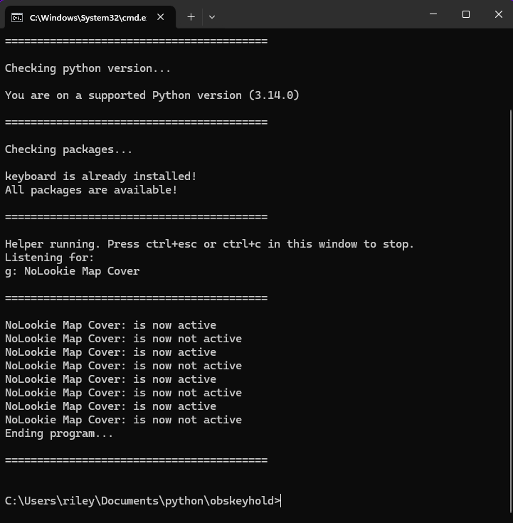 obskeyhold.py is a Windows-only helper tool designed for streamers who use OBS Studio while playing games such as Rust, DayZ, or other open-world titles where showing the in-game map could reveal their position to viewers. When you hold down certain keys in-game, OBS can automatically toggle overlays or sources (like hiding a map capture). This script automates that key press/release behavior, using Python to send **virtual key events (F13–F24) — keys that OBS can detect as hotkeys without interfering with your normal gameplay.